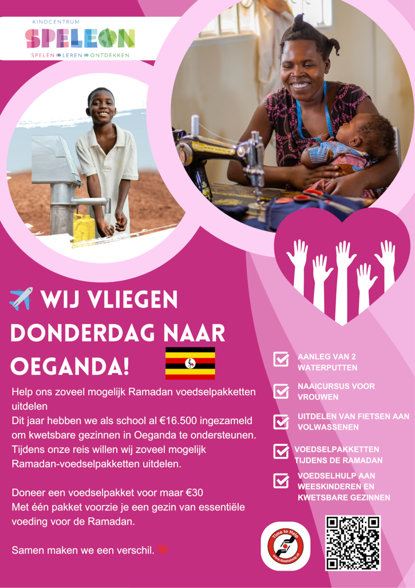 Dit jaar hebben we als school al €16.500 ingezameld om kwetsbare gezinnen in Oeganda te ondersteunen. Tijdens onze reis willen wij zoveel mogelijk Ramadan‑voedselpakketten uitdelen — en jij kunt daarbij helpen!